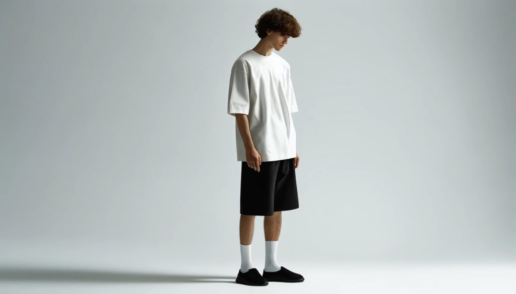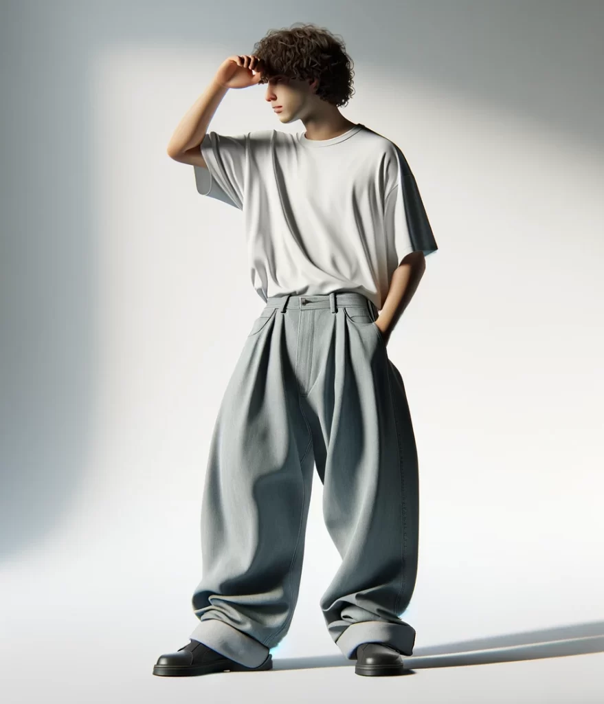 - ボトムス:バギーシルエットのデニムを選び、都会的な雰囲気を強調。デニムのリラックスフィットが、Tシャツのモダンなラインとマッチします。