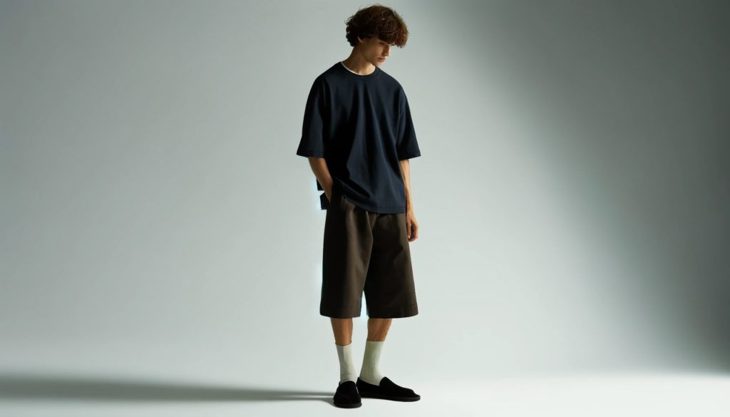 - ボトムス:ワイドなショートパンツを合わせることで、リラックスした印象を演出。パンツのゆったりとしたカットが動きやすさを提供します。